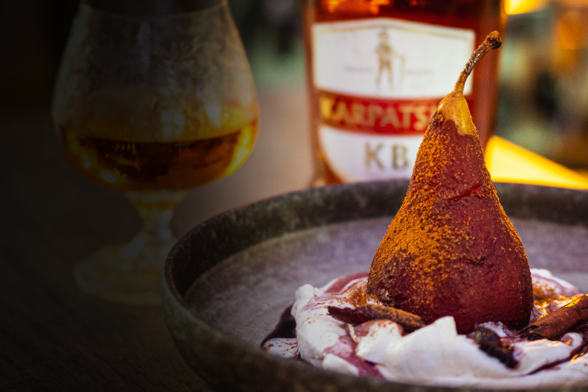 Do hrnca si nalejeme víno a vložíme rôzne druhy korenia perníkového typu. Odporúčame hlavne celú škoricu rozlomenú na menšie kúsky, pár kúskov badyánu, kardamon (najlepšie celé kúsky, ale môže byť aj mletý), klinčeky a hlavne pomarančovú kôru, ideálne čerstvú ( prípadne sušenú). Koreniny je najlepšie vyladiť podľa vlastnej chuti, jednoducho akoby ste si pripravovali varené víno. Na záver na vyladenie chuti do vína pridáme 2 dcl Karpatského KB. Ďalej si pripravíme a ošúpeme 4 veľké hrušky, odrežeme z nich spodnú časť tak, aby sa dali pri servírovaní postaviť. Takto ich vcelku dáme variť do pripraveného červeného vína a varíme do mäkka približne 30 minút. Presný čas varenia záleží aj od veľkosti, zrelosti a tvrdosti použitých hrušiek. Dávame pozor, aby sa nám varením hrušky nerozpadli – aby boli al dente.